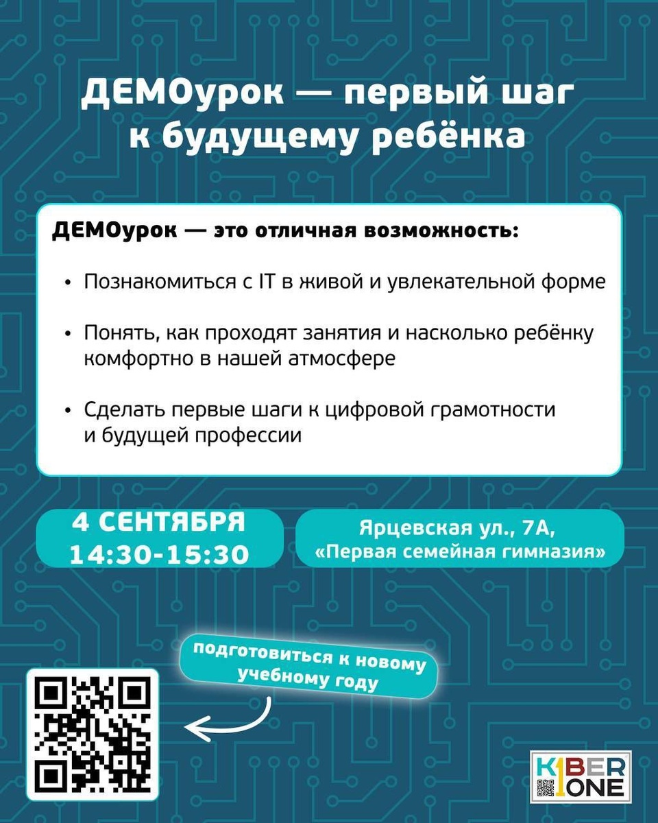 Пробное занятие в KIBERone – первый шаг в IT 🖥 Все еще не определились, стоит ли идти в KIBERone? У нас есть решение! Знакомство с IT-школой ваш ребенок может начать с ДЕМОурока. На нем ребята изучают нейросети, создают собственные игры и учатся основам программирования. Кстати, каждый может найти себе модули по душе – так что это отличная возможность прийти на пробное занятие и понять в каком направлении развиваться вашему ребёнку ⚡️ 🗓 4 сентября 📍Ярцевская ул., 7А, «Первая семейная гимназия» #семейноеобразование #образованиедетей #дети #школа Погружаемся в новый учебный год с KIBERone: 🌐 https://mc-kiberone.ru