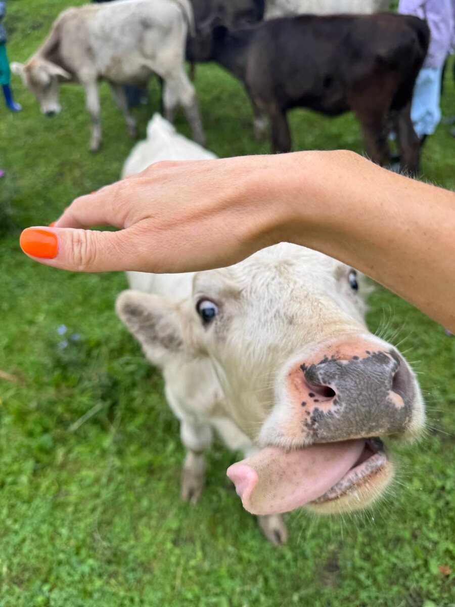 Интересное место, но история возникновения еще интереснее. Настоящая история для сериала❤️ Никитины-это семья Александры и Максима, и их 5 детей. Еще 36 коров🐄 Мильона кошек 🐈 На зиму они приготовили 490 стогов сена, и как бы это не с запасом. Александра сама москвичка, но судьба привела ее сюда в 19 лет. Теперь она умеет делать все деревенские дела и даже несколько сортов сыра, масло, творог и все такое молочное 🥛 Сыр мы долго дегустировали, смаковали каждый кусочек. Взяли и домой, чтобы уже совместить с бокальчиком игристого🍷по заказу, раз в неделю, привозят в Москву. Телята разновозрастные, есть которому месяц, есть три и год. Конечно же и мамки рядом. Старшее поколение аппетитно уплетало наши яблочки, а мелкие, как дрессированные собачки играли с нами. Они привыкли к гостям и круто идут на контакт. Дети Никитиных активно участвуют в рабочем процессе. Показали нашим детям, как прыгать на стогах и кормить маленьких телят. На мастер класс мы не записались, но он тоже есть, только