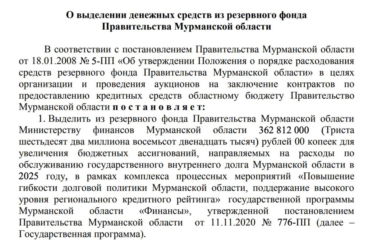На расходы по обслуживанию государственного внутреннего долга Мурманской области в 2025 году областное правительство планирует выделить 362,8 млн рублей. Согласно проекту постановления, деньги на долг пойдут из резервного фонда. ❄ «Арктический Обозреватель»