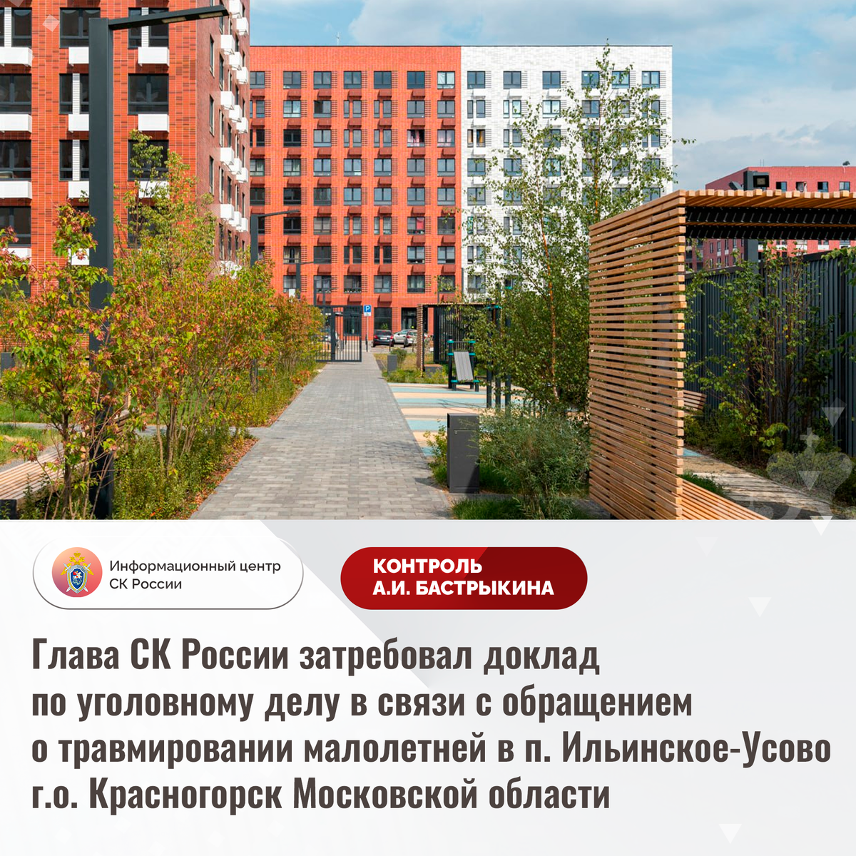 Глава СК России затребовал доклад по уголовному делу в связи с обращением о травмировании малолетней в п. Ильинское-Усово г.о. Красногорск Московской области В комментариях в аккаунте Информационного центра СК России «ВКонтакте» обратилась жительница Московской области по вопросу травмирования ее 16-летней дочери в поселке Ильинское-Усово городского округа Красногорска. В июле текущего года из-за ненадлежащего содержания сотрудниками управляющей компании общедомового имущества девочка при выходе с огороженной территории жилого комплекса получила травму. Пострадавшей потребовалась медицинская помощь. В ГСУ СК России по Московской области по данному факту возбуждено уголовное дело. Председатель Следственного комитета Российской Федерации Александр Иванович Бастрыкин затребовал у руководителя ГСУ СК России по Московской области Ярослава Александровича Яковлева доклад о предварительных и окончательных результатах расследования уголовного дела. Исполнение поручения поставлено на контроль в