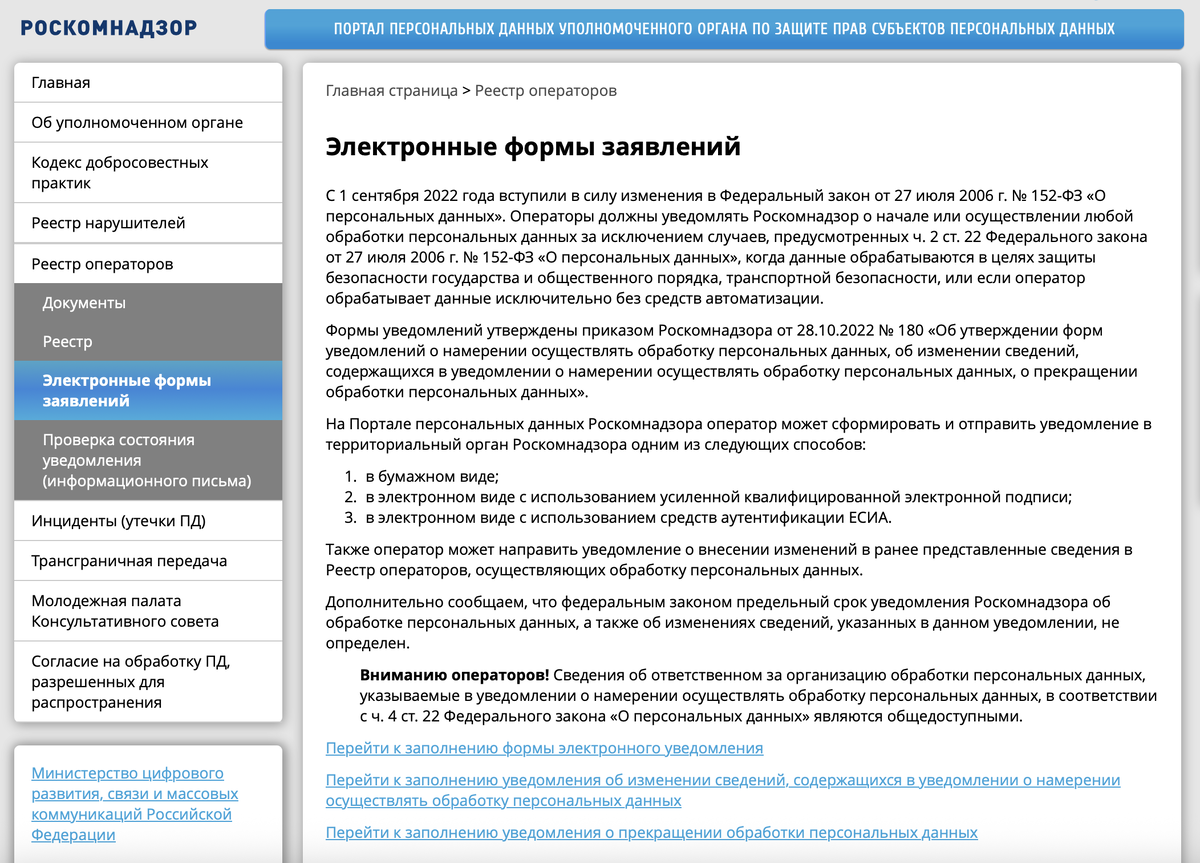 Как подать уведомление? Всё можно сделать онлайн на сайте Роскомнадзора. Сервис удобный: можно сохранить черновик, чтобы заполнить позже, а затем: