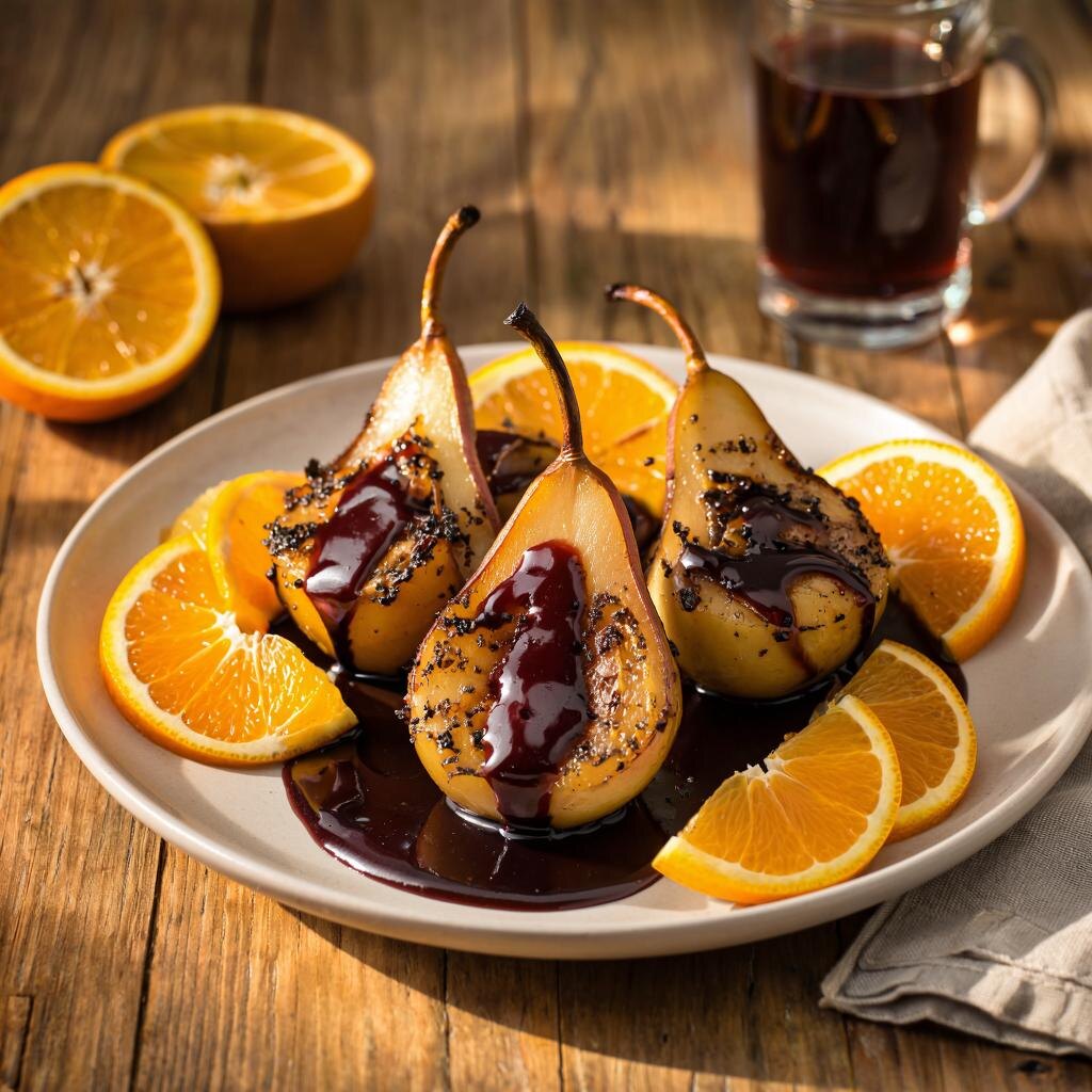 Этот рецепт представляет собой изысканное сочетание сладкого вкуса груш и насыщенного аромата вина с пряностями. Такое блюдо станет отличным дополнением к праздничному столу или приятным угощением для гостей. Ингредиенты: - Груши спелые крупные — 4 шт. - Красное сухое вино — 500 мл - Сахарный песок — 1 стакан - Ванильный стручок — 1 шт. - Палочка корицы — 1 шт. - Гвоздика — 4 бутона - Апельсин свежий — 1 шт. - Лимонный сок свежевыжатый — 1 столовая ложка - Вода питьевая кипяченая — 100 мл Как приготовить 1. Подготовка ингредиентов: - Очистите груши от кожуры и удалите сердцевину, оставив плод целым. Для удобства удаления сердцевины можно воспользоваться специальным ножом или ложечкой. - Нарежьте апельсин тонкими кружочками и отложите для украшения блюда. 2. Варка сиропа: - Налейте красное вино в кастрюлю среднего объема. - Добавьте сахарный песок, ванильный стручок (разрежьте вдоль пополам), палочку корицы и гвоздику. - Поставьте кастрюлю на средний огонь и доведите с