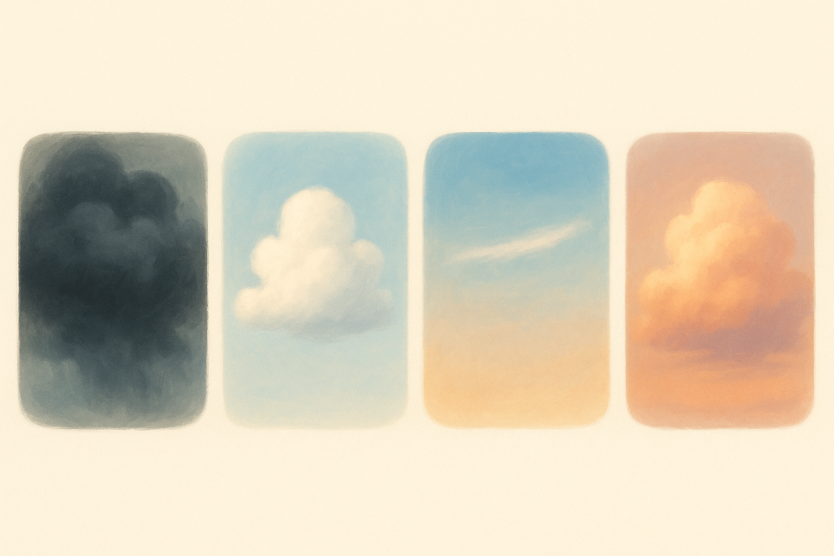 Иногда, чтобы понять себя, не нужно сложных формул — достаточно посмотреть на небо или хотя бы — на образ неба внутри. В этом тесте каждый выбирает облако, в котором сейчас узнаёт своё состояние. То, что витает в воздухе, давит на грудь или, наоборот, даёт передышку. Выберите одно. Не думайте долго — что откликнется сразу, то и верно. 🤍 Подписывайтесь, если такие образы вам близки. Тут мы говорим о чувствах, боли, честности и пути к себе. Ваш отклик — это поддержка моих стараний и мотивация создавать дальше. Вы будто на грани. Напряжение в теле, голова тяжёлая, мысли вязкие. Возможно, вы накапливаете раздражение или тревогу — и не даёте себе выход. Это состояние может быть знаком: «ты перегружен, те надо выдохнуть». Вы часто держитесь, тянете, а внутри то уже давно гремит. 💬 Статья которая продолжает тему такого состояния: Ваш внутренний фон сейчас — достаточно устойчивый. Это не эйфория, не восторг, но чистое, ясное пространство. Вы научились немного разряжать напряжение, отпускать