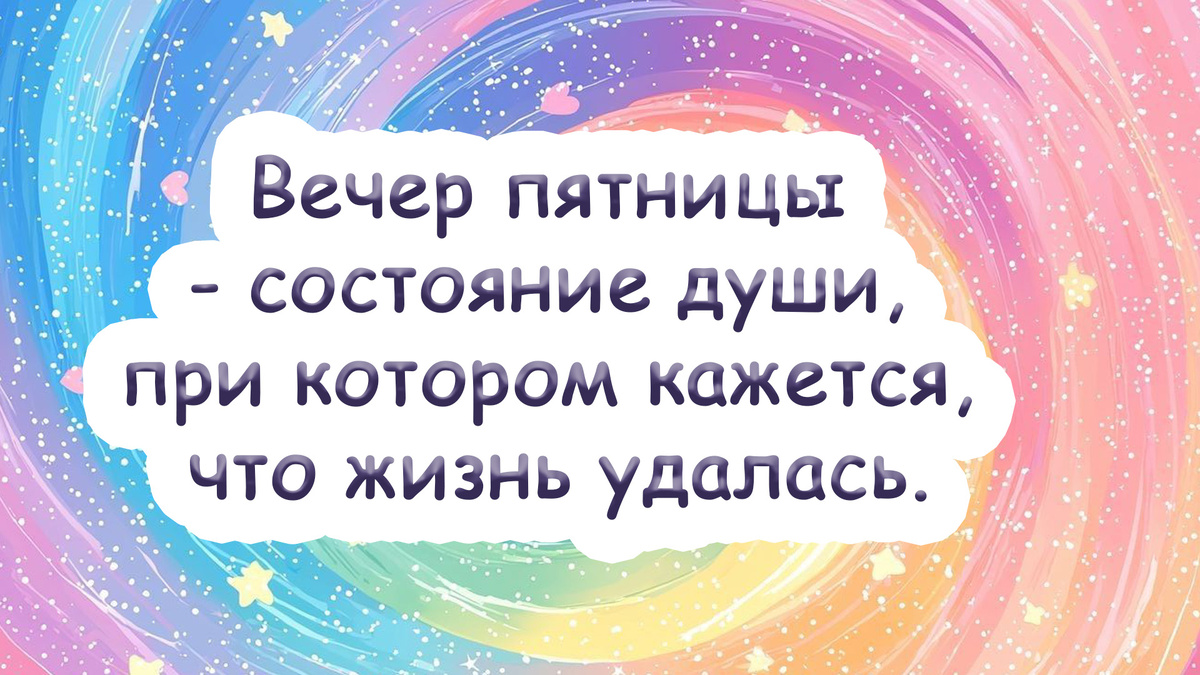 И пусть это состояние длится как можно дольше! Ведь именно такие моменты делают нашу жизнь по-настоящему яркой и счастливой. Потом, конечно, будет суббота, воскресенье, и снова рабочая неделя. Но пока что – полный релакс и ощущение абсолютного счастья!