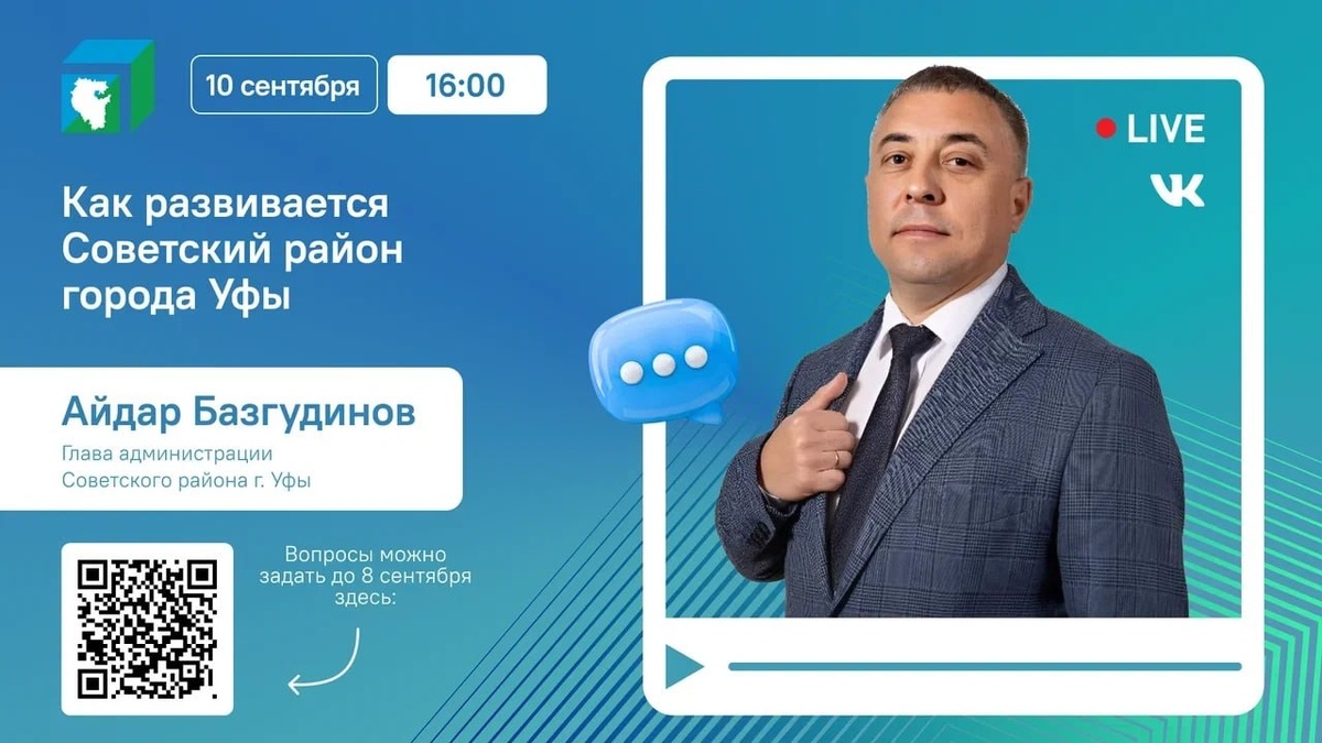 Как развивается Советский район Уфы? Какие проблемы волнуют его жителей? На эти и другие вопросы ответит глава района Айдар Базгудинов. Прямой эфир состоится 10 сентября 2025 года в 16:00 часов. Свои вопросы можно оставить до 8 сентября включительно на Платформе обратной связи на портале Госуслуг https://pos.gosuslugi.ru/lkp/direct-line/9771/ Трансляцию смотрите в соцсетях на страницах главы Советского района и ЦУР Башкортостана. 💚 ЦУР Башкортостана