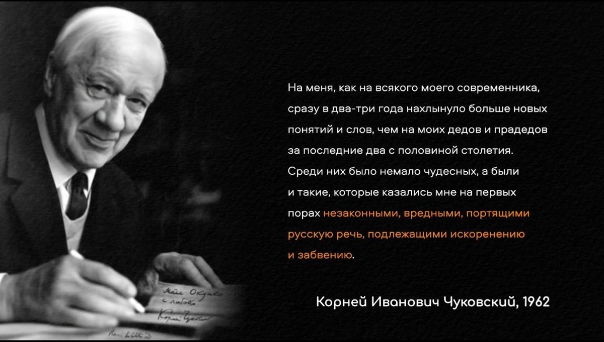 (Читаем русских пуристов и рассуждаем о том, портится ли язык. Часть 5/6) А вот уже в 20 веке в 1962 году всеми любимый детский писатель Корней Чуковский в книге «Живой как жизнь» пишет: 💬 «На меня, как на всякого моего современника, сразу в два-три года нахлынуло больше новых понятий и слов, чем на моих дедов и прадедов за последние два с половиной столетия. Среди них было немало чудесных, а были и такие, которые казались мне на первых порах незаконными, вредными, портящими русскую речь, подлежащими искоренению и забвению. Помню, как страшно я был возмущен, когда молодые люди, словно сговорившись друг с другом, стали вместо “до свиданья” говорить почему-то “пока”» И хотя, Корней Иванович не был записным пуристом, он даже их немного высмеивал в своей книге, но он все равно не мог избежать эмоциональных высказываний о речи молодежи 😁 Вообще, надо сказать, что книга интересная. Как писатель и словесник, он понимает, что язык нельзя поменять, но при этом, как представитель старшего пок