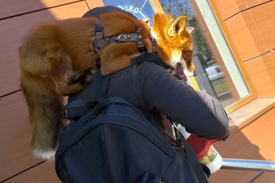 В центре Ярославля лис катался на шее хозяина Очевидцы успели сфотографировать необычного питомца. Владелец выгуливал его на Ленинградском проспекте. Идти по улице лис, вероятно, не захотел. А может, просто устал. Хозяин посадил его на плечо. Намордника у животного не было. Но для лисиц он правилами содержания домашних питомцев и не предусмотрен: это же не собака. Зато рыжий был в красивой шлейке и на поводке.