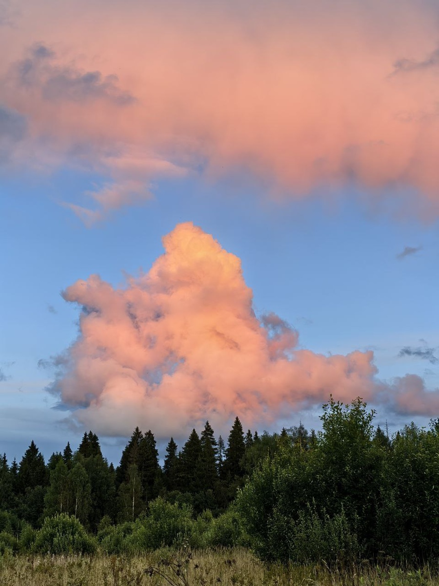 Летний вечерний пейзаж и облака (Комарово, Клин) #sky #blue #beforesunset #clouds #pink #grey #rural #landscape #forest #Komarovo #Klin #summer #August #небо #голубое #передзакатом #облака #розовые #серые #сельский #пейзаж #лес #Комарово #Клин #лето #август
