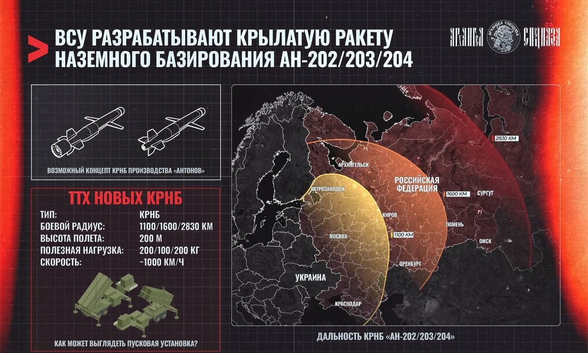 На Украине создают крылатую ракету наземного базирования?💬 ✍️ АО «Антонов» - украинское государственное предприятие, которое занимается воздушными грузоперевозками, а так же разработкой, производством и ремонтом самолётов серии "Ан". 💭Однако с начала СВО формат работы был изменен, и на предприятии начали также собирать беспилотники. Например, БпЛА «Лютый» производят на заводе «Антонов». ❗️Но это не все. Данное предприятие, по нашим данным, занялось новой разработкой – проектированием, постройкой опытного образца и запуском в серийное производство КРНБ, то есть крылатой ракеты наземного базирования. 💭Создаваться они будут под маркировкой Ан-202, Ан-203, Ан-204. Предполагается, что дальность последней модификации будет достигать 2830 км. 💭Данные ракеты стоят на одном производственном конвейере с ракетами «Фламинго». Но при этом пока не ясно, как она будет выглядеть и с чего конкретно будет запускаться. Это может быть как колесная база, так и пусковая на прицепе. Далее читайте