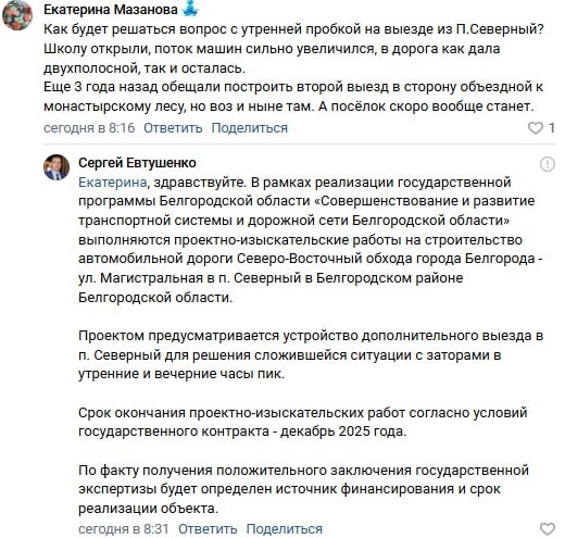 Из Северного в сторону Белгорода появится новый выезд Работы начались после жалоб жителей на пробки, которые образовались из-за открытия новой школы и возросшего трафика. Двухполосная дорога не справляется с потоком машин в часы пик. Министр автомобильных дорог и транспорта региона Сергей Евтушенко сообщил, что проект нового выезда уже в работе. «Проектом предусматривается устройство дополнительного выезда в п. Северный для решения сложившейся ситуации с заторами в утренние и вечерние часы пик», – подчеркнул Сергей Евтушенко. Проектно-изыскательские работы планируется завершить в декабре 2025 года. После прохождения госэкспертизы определят источник финансирования и точные сроки строительства. Подписаться на нас|Предложить новость