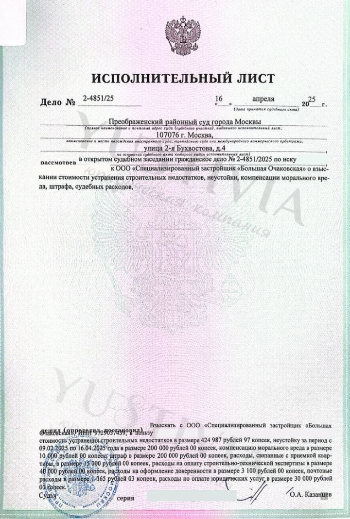 🎓 Получен исполнительный лист по Застройщику: ООО "СЗ "БОЛЬШАЯ ОЧАКОВСКАЯ" ➿➿➿➿➿➿➿➿➿➿ О взыскании компенсации за строительные недостатки по договору купли-продажи Преображенский районный суд города Москвы Дело: 02-4851/2025 Площадь: 33 м² Судья: Казанцев О.А. ➿➿➿➿➿➿➿➿➿ Взысканные суммы: ➡️Недостатки: 424 987,97; ➡️Неустойка за невыплату: 200 000; ➡️Моральный вред: 10 000; ➡️Штраф: 200 000; ➡️Судебные расходы: 89 465,03. ➿➿➿➿➿➿➿➿➿ 💸 Итого: 924 453 рублей ❤️При заключении договора на взыскание компенсации с застройщика за некачественную отделку мы оплатим за Вас строительно-техническую экспертизу! Yustivia – мы на вашей стороне в борьбе за справедливость!🆗 ➿➿➿➿➿➿➿➿➿ 📞+7 (936) 333-33-48 ✅@Yustivia