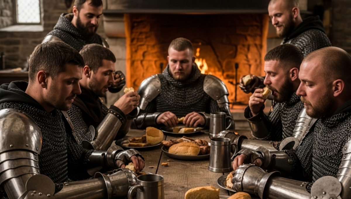 Средневековые рыцари в массовом сознании ассоциируются с турнирами, походами и замками. Но за героическими образами стояла повседневная жизнь, и её важной частью была еда. Стол рыцаря отличался от крестьянского, но вовсе не всегда изобиловал деликатесами. Рацион зависел от времени года, достатка и даже религиозных запретов. Главным продуктом для всех сословий Европы был хлеб. У крестьян он был грубым, из ржи или овса, а у знати — более белым, из пшеницы. Хлеб служил и своеобразной посудой: куски использовались вместо тарелок, а после трапезы отдавались слугам или собакам. Наряду с хлебом важное место занимали каши и похлёбки. Их готовили из ячменя, овса, пшеницы или бобовых. В кашу добавляли мясо, овощи и специи, если позволял достаток. Это блюдо было питательным и удобным — особенно для рыцарей в походах. Рыцарский стол невозможно представить без мяса. Свинина, говядина, баранина и птица — основные продукты, которые употребляли в пищу. Особым уважением пользовалась дичь: оленина, каба