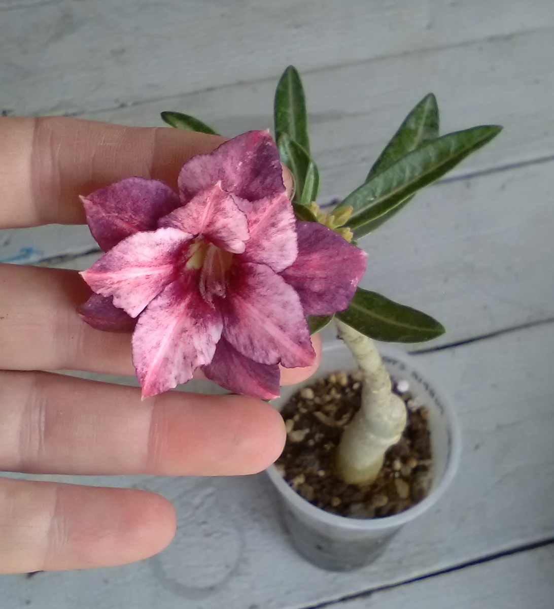 Буря мглою небо кроет... Буря - это вот этот коротышка росточком в 15 см и крошкой- цветочком😅 Как бы там ни было, но это Purple Storm - знакомьтесь, мои дорогие читатели! Этот сорт появился у меня в прошлом году и ещё ни разу не цвел. Справедливости ради надо сказать, что он не раз пытался это сделать. Всё лето упорно гонит бутоны и так же упорно их сбрасывает. Может быть это из-за того, что прививочка маленькая, худенькая, зимой она чуть не отправилась на цветочную радугу. К счастью, выкарабкалась, но за все это время подросла очень мало. Так хотелось увидеть его цветение, но я уже и надежду потеряла. И вдруг, однажды утром бросила взгляд на свои адениумы и увидела, что буря всё таки разразилась! Такой хоршенький!! Очень нравится форма цветка в полуроспуске, второй ряд как корона. Цвет тоже изумительный, пурпурно-фиолетовый, один из моих любимых. Со временем светлеет, насыщенный фиолетовый становится как будто припыленным, но такой вариант мне тоже нравится. И форма, и размер цвет