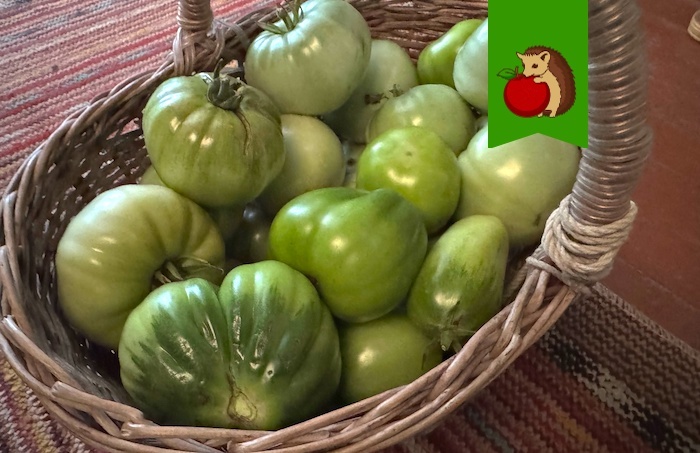 Недозревшие помидоры... Они есть в жизни каждого дачника. Кто-то собирает их с целью сложить дома, чтобы они медленно доходили до нужной кондиции, и была возможность есть свои овощи с огорода как можно дольше. У кого-то плоды просто не успевают вызреть на кустах. У нас так часто бывает: если август выдается холодным, оп, и помидоры дружно перестают наливаться и краснеть. Не снимаешь их – можно потерять и вовсе, если разгуляется фитофтора. Поэтому, думаю, таким богатством, как зеленые помидоры, могут похвастаться многие дачники. Конечно самый очевидный вариант, что с ними делать – пустить на дозаривание дома. Я складываю плоды в ящики, туда же помещаю спелый банан. И томаты потихоньку краснеют и спеют. Зачем банан? Он выделяет этилен, который способствует более быстрому созреванию. Можно взять не банан, а любой другой фрукт или овощ. Кстати, если наоборот хотите замедлить созревание томатов, хранящихся дома, регулярно доставайте созревшие экземпляры, чтобы они не торопили остальные. Но