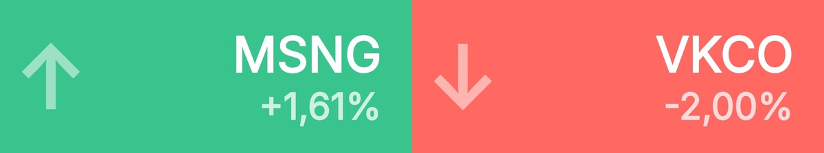 🔺 Топ-10 лидеров роста среди крупнейших акций: Мосэнерго • 2,24 ₽ • 1,61% Эн+ • 461 ₽ • 1,07% ЭЛ5-Энерго • 0,54 ₽ • 0,98% МТС • 222 ₽ • 0,75% Лукойл • 6 423 ₽ • 0,47% Транснефть • 1 323 ₽ • 0,47% Банк ВТБ • 75,46 ₽ • 0,44% Ренессанс • 121 ₽ • 0,40% Хэдхантер • 3 578 ₽ • 0,31% Алроса • 46,15 ₽ • 0,30% 🔻 Топ-10 лидеров падения среди крупнейших акций: VK • 329 ₽ • -2,00% Фикс Прайс • 0,79 ₽ • -1,63% ЮМГ • 794 ₽ • -1,59% Группа Рус • 132 ₽ • -1,58% Селигдар • 46,01 ₽ • -1,58% М.Видео • 91,40 ₽ • -1,56% Сегежа • 1,57 ₽ • -1,39% Совкомфлот • 85,54 ₽ • -1,34% Газпром • 130 ₽ • -1,28% Циан • 612 ₽ • -1,20%
