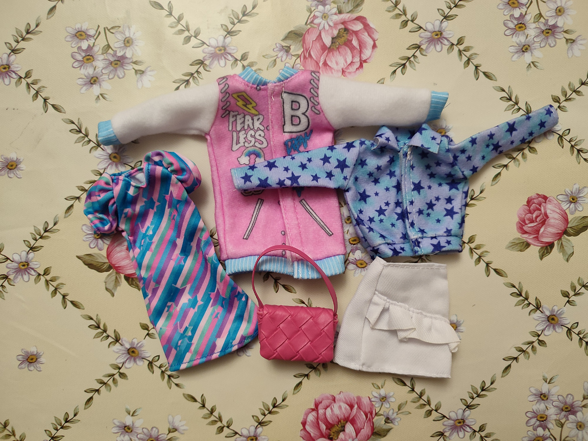 Перебирала я как то гардероб моих кукол и поняла, что не хватает мне каких то ярких оттенков. Все у них какое то чёрное, слишком реалистичное и человеческое. Давно поглядывала на Алике на одежду для кукол с оригинальных Барби, круто, что их можно купить отдельно от кукол. Решила купить несколько вещей в одной цветовой гамме, более приближенной друг к другу. И вот такая барбейская капсула у меня получилась. Так же купила классную сумочку из Мини Фешэн, которая кстати отлично смотрится со всеми нарядами. Худи, платье, юбка и клевая звёздная ветровка. Все прошито хорошо, швы ровные, кое где правда торчат нитки, но их можно обрезать. Сумочка это прям отдельное восхищение, уже минут 30 кручу её в руках и походу хочу себе такую же😄 Швы так же ровные, она как будто прямо из набора, а не отдельно от него. Закрывается на магнитик, теперь мне так же надо для самодельных сумок. Не обращайте внимания на мои потресканные грязные пальцы, я сегодня после грибов😁 Теперь жду когда ко мне