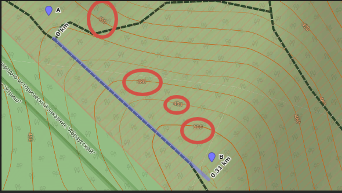 ЧХВ - Чистое Ходовое Время, имеет формулу приведённую ниже и нужна она для того, чтобы определять скорость движения туриста по горной местности. Рассчитывать её нужно не только для того чтобы, успеть вернуться в цивилизацию до наступления темноты, но и для составления графика движения при многодневных и автономных походах. T = (10 Х H + L)/V, где: Нужно заметить, что 3 км/ч, это скорость хорошо подготовленного туриста, Новичкам, которые будут идти с тяжёлыми рюкзаками, стоит рассчитывать формулу исходя из скорости 2 км/ч. На одни сутки закладывается движение не более 7-ми часов. Нужно также учитывать время привалов, по 10-15 минут, через каждые 45-50 минут. И это ещё не всё. Но болле детально о препятствиях, отнимающих ваше время, я расскажу ниже. Смотрим на отметки высоты в красных кружках; 450, 480, 490 и 500 метров над уровнем моря. Следовательно, между каждой линией мы имеет разницу в 10 метров в высоту. Итак, путь от перекрестка (точка А), до отметки 510 метров над уровнем моря