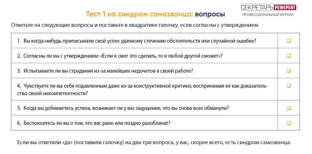 Читайте статью сентябрьского номера журнала "Секретарь-референт" Синдром самозванца у секретарей и помощников, или Как работать со своей ценностью «Синдром самозванца»? Очередное новомодное, рассчитанное на сенсацию выражение, о котором в последние годы трубят обложки разных журналов и профизданий? Или все же тема, заслуживающая пристального внимания, особенно помощников и секретарей? Читать статью