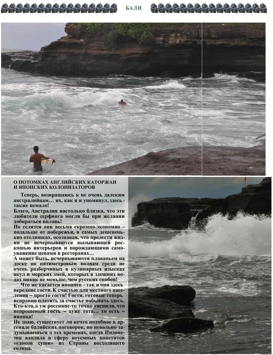 А может быть, исчерпываются плаваньем на доске по пятиметровым волнам среди не очень разборчивых в кулинарных изысках акул и морских змей, которых в здешних водах никак не меньше, чем русских снобов!