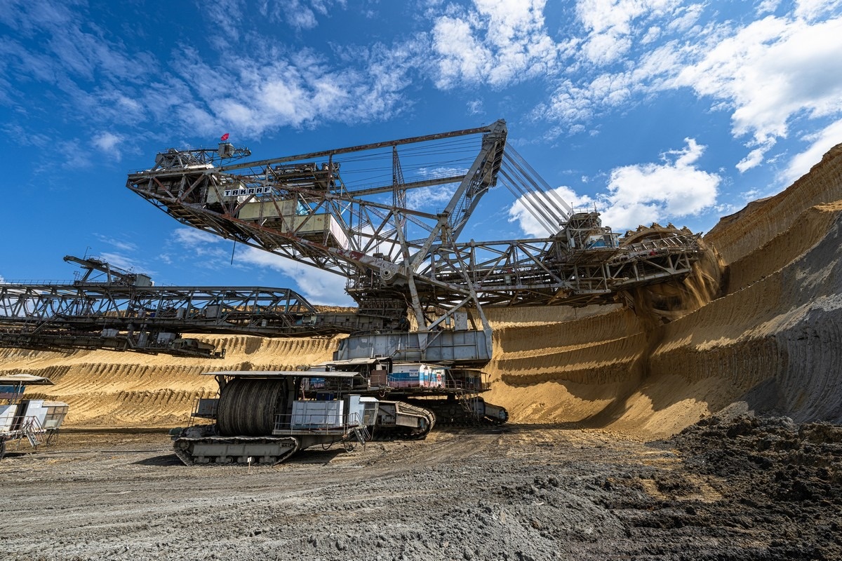 Но самое интересное здесь однозначно — циклопических размеров шагающий экскаватор, который снимает пустую породу («вскрышу») и лентой транспортёра перекидывает её в отвал за линией добычи угля. Конструкция эта настолько огромна, что вблизи даже в широкоугольный объектив влезает только частично: