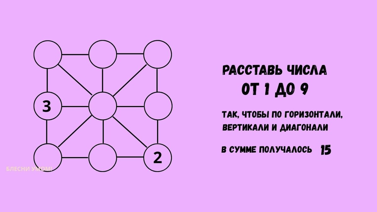 Перед вами квадрат 3×3 (немного преобразованный), в котором нужно расставить числа от 1 до 9. ☝Условие одно: сумма чисел в каждом круге по вертикали, горизонтали и обеих диагоналях должна быть равна 15. 👉Каждое число используется только один раз. Две цифры уже стоят на своих местах - так что отталкиваться есть от чего. Это не просто арифметика — это проверка вашей способности видеть структуру и мыслить логически.