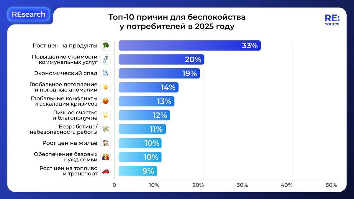 🔹🔹🔹 Растущие цены на продукты волнуют потребителей больше всего Главными причинами для беспокойства в 2025 году стали, можно сказать, бытовые проблемы — увеличение стоимости продуктов и коммунальных услуг. А вот с третьего по пятое место как раз расположились глобальные проблемы. Люди сильно переживают за экономику, всемирное потепление и международные конфликты. Из интересного: проблема растущих цен на жилье находится в рейтинге довольно низко. Завидуем тем, кто не переживает за это… Источник: NielsenIQ, Gfk #REsearch Подписаться на RE:source