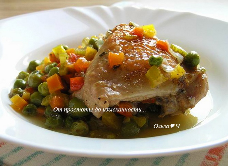 майоран, кориандр по вкусу Приготовление: Куриные бедра посолите, поперчите, выложите (кожей вверх) в смазанную маслом форму для запекания. Запекайте при 200*С около 20 минут. В это время приготовьте соус. Лук мелко нарежьте, обжарьте в сливочном масле (я заменила небольшую часть сливочного масла растительным). Присолите, всыпьте муку. Хорошо перемешайте. Добавьте мелко нарезанные перцы, морковь, сельдерей и горошек. Готовьте 5-7 минут, помешивая. Всыпьте майоран. Добавьте кориандр, перемешайте. Курицу выньте из духовки, затем переложите на тарелку. В форму влейте подготовленный соус. Верните курицу обратно, перевернув кожей в
