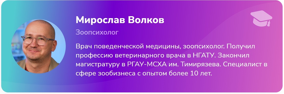 - Автор курса: Мирослав Волков — зоопсихолог, врач поведенческой медицины с опытом 10+ лет.