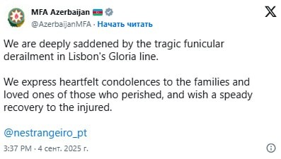 🇦🇿🇵🇹 Министерство иностранных дел Азербайджана выразило соболезнования Португалии в связи с крушением фуникулера "Глория" в Лиссабоне. Соответствующая публикация размещена на официальной странице ведомства в соцсети Х. "Трагическое крушение фуникулера "Глория" в Лиссабоне сильно опечалило нас. Выражаем глубочайшие соболезнования семьям и близким погибших и желаем скорейшего выздоровления пострадавшим", - говорится в публикации. Отметим, что в результате схода с рельсов фуникулера "Глория", одного из главных символов города, в столице Португалии Лиссабоне 3 сентября погибли 17 человек, еще свыше 20 человек пострадали. #ruoxuaz #МИДАзербайджана #соболезнованияПортугалии ✈️ Новости Азербайджана 🔗 Написать нам