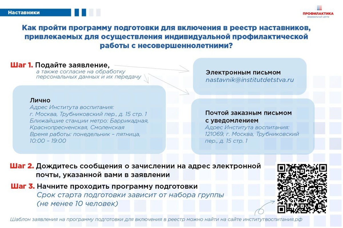 Стартует набор наставников! ⚡️Институт воспитания открывает заявочную кампанию для тех, кто хочет стать наставником и помогать детям в их развитии и воспитании! Как стать частью команды наставников? Вы можете подать заявление одним из удобных способов: 📌Лично в Институте воспитания (Москва, Трубниковский переулок, д. 15, стр. 1) 📌По почте заказным письмом с уведомлением (121069, Москва, Трубниковский переулок, д. 15, стр. 1) 📌Электронно на адрес:nastavnik@institutdetstva.ru К заявлению необходимо приложить согласие на обработку персональных данных. При отправке почтой потребуется копия паспорта. 🚩О зачислении вы получите уведомление на email. Группа формируется от 10 человек Что вы получите? После успешного прохождения подготовки — официальный документ, подтверждающий вашу квалификацию! Формы заявлений доступны на сайте. 🚩 Минобрнауки РД