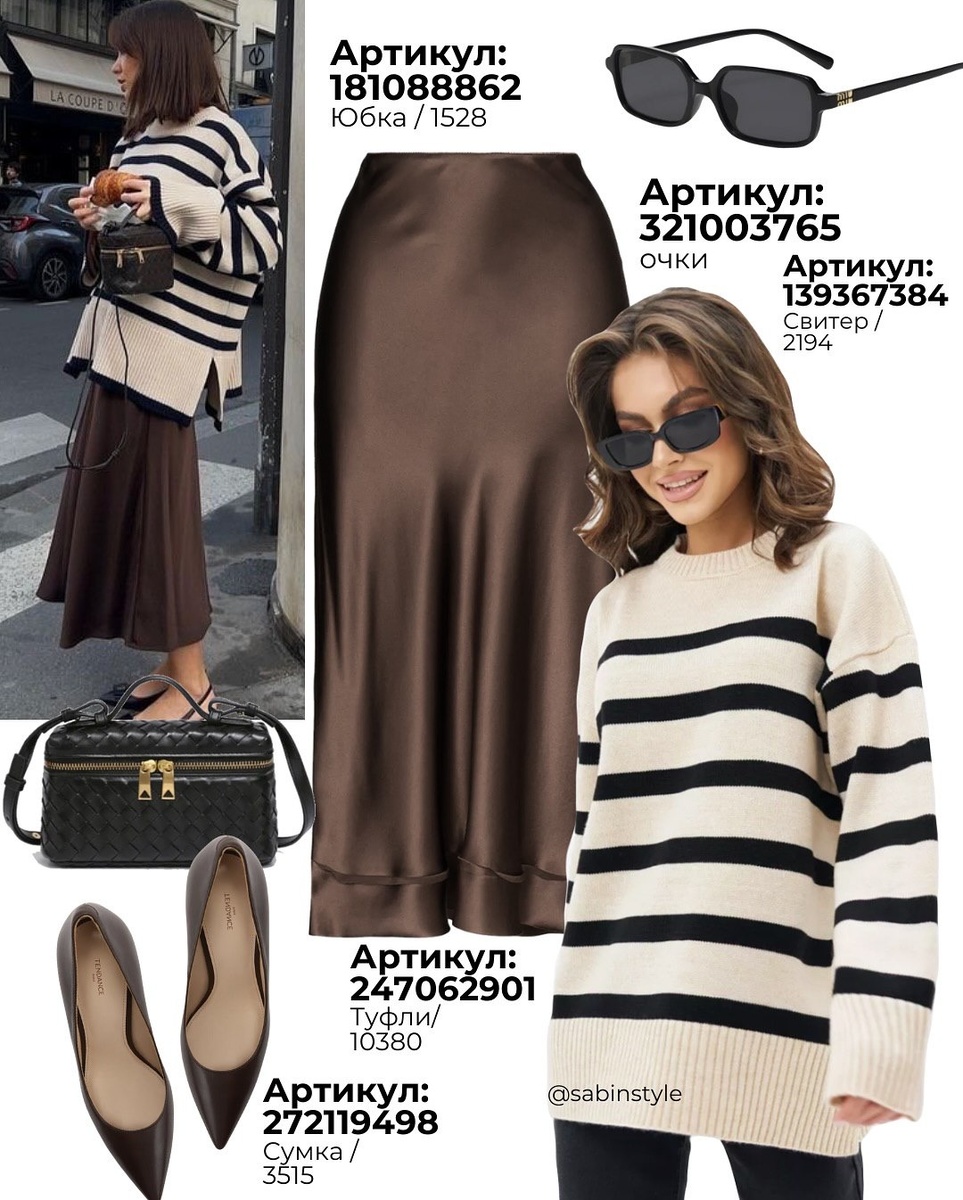 Один образ — множество сценариев. Полосатый свитер, сатиновая юбка, острые лодочки, мини-сумка и прямоугольные очки — это капсула, которая легко адаптируется под город, офис и вечер, а шоколадный оттенок делает аутфит особенно уютным и осенним.