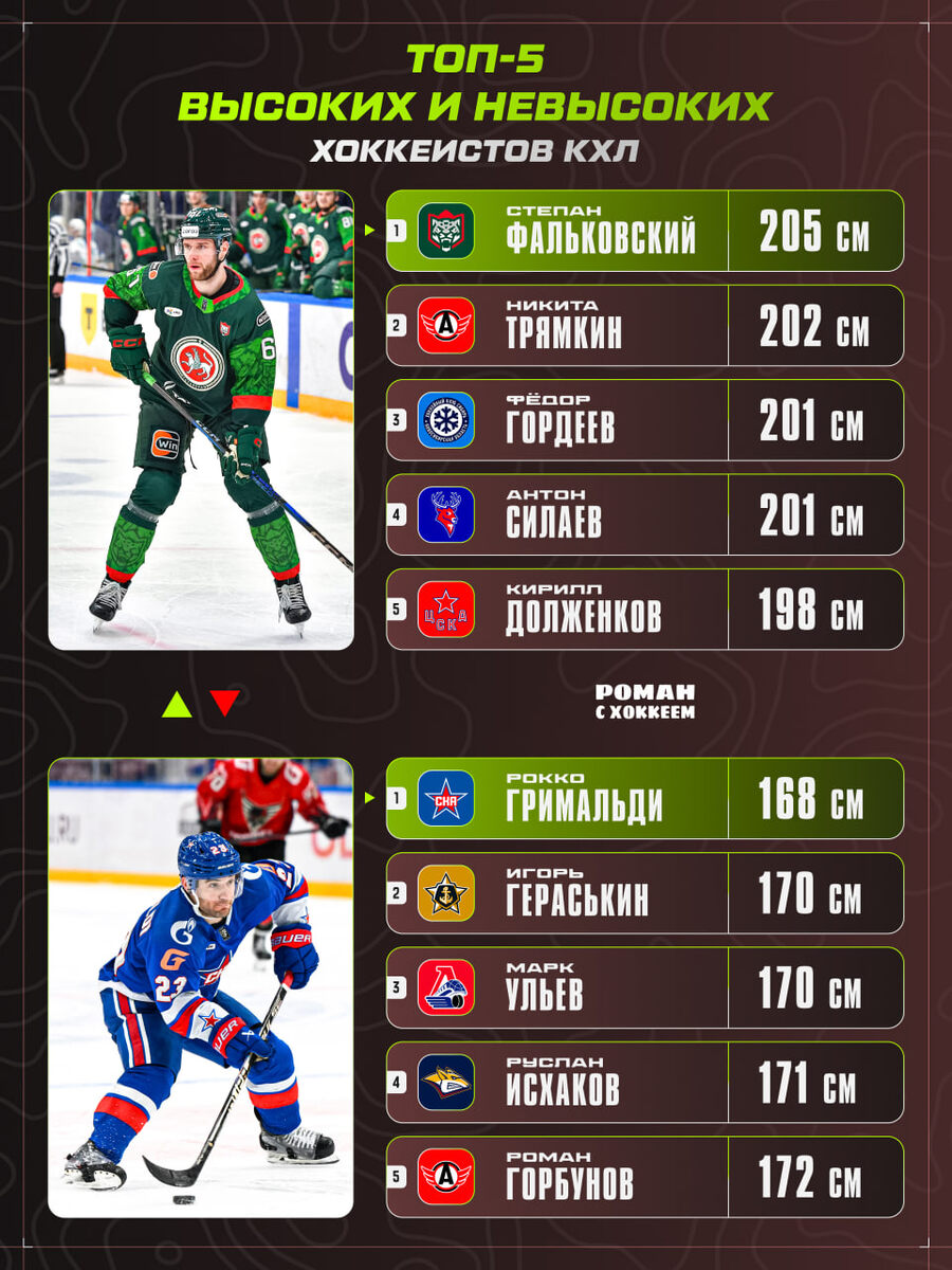 Вам понравилась серия постов со средним ростом, весом и возрастом команд КХЛ, поэтому я решил сделать подборку топ-5 игроков по разным показателям 😎 Список самых высоких открыл Степан Фальковский (205 см). Самый невысокий хоккеист — Рокко Гримальди (168 см)