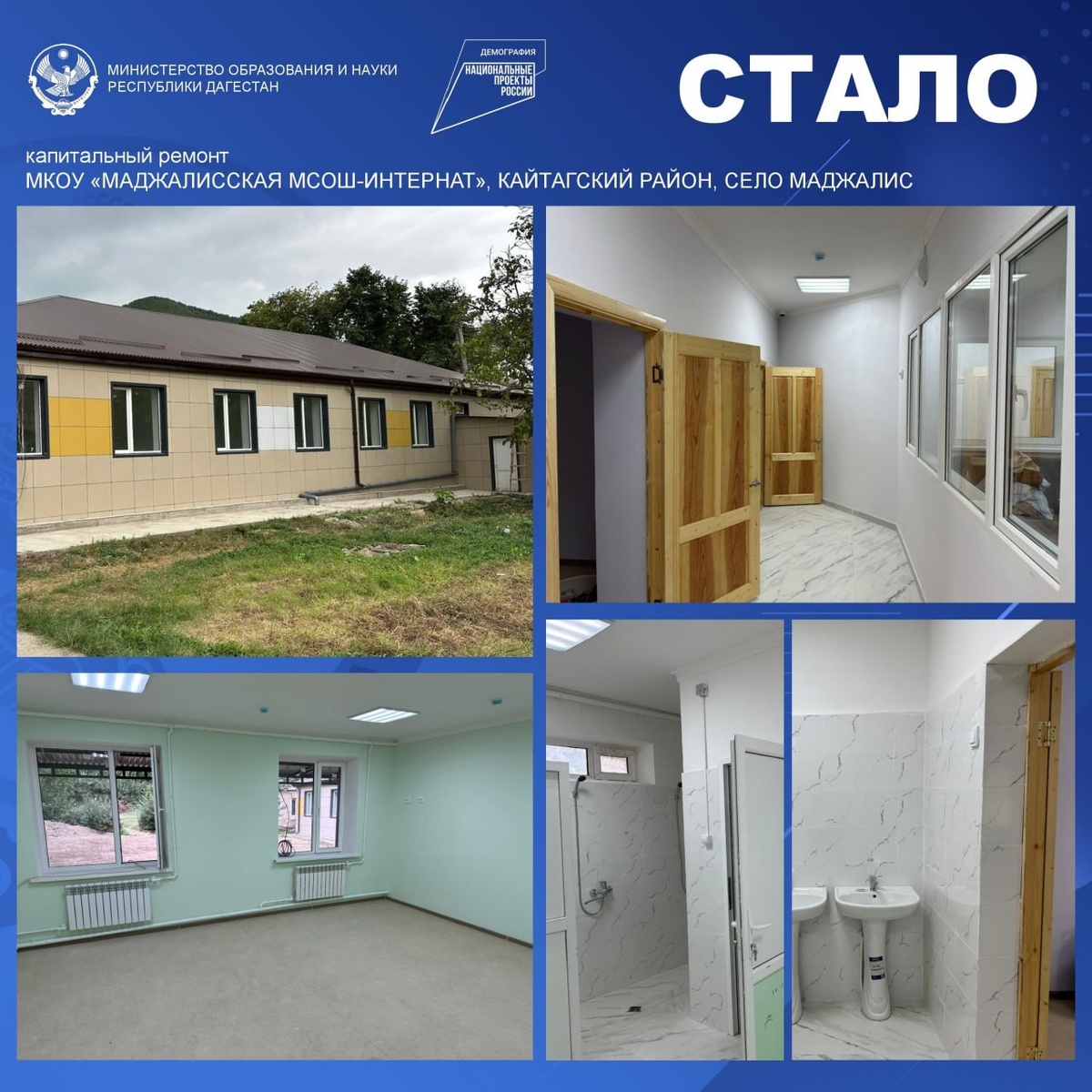 #Школабудущегосегодня В Кайтагском районе теперь обновлённая и современная школа! 📏В рамках реализации национального проекта «Молодежь и дети» проведён капитальный ремонт Маджалисской МСОШ - Интерната. Программа включала в себя полное обновление внутреннего оборудования, ремонт фасада, актового зала, пищеблока, санузлов и всех учебных кабинетов. Школа отвечает современным требованиям, а самое главное — стала более удобной и безопасной для учеников и учителей. Одновременно муниципалитеты взяли на себя встречные обязательства: благоустроили прилегающую территорию, усилили меры противопожарной безопасности, навели порядок вокруг школ.