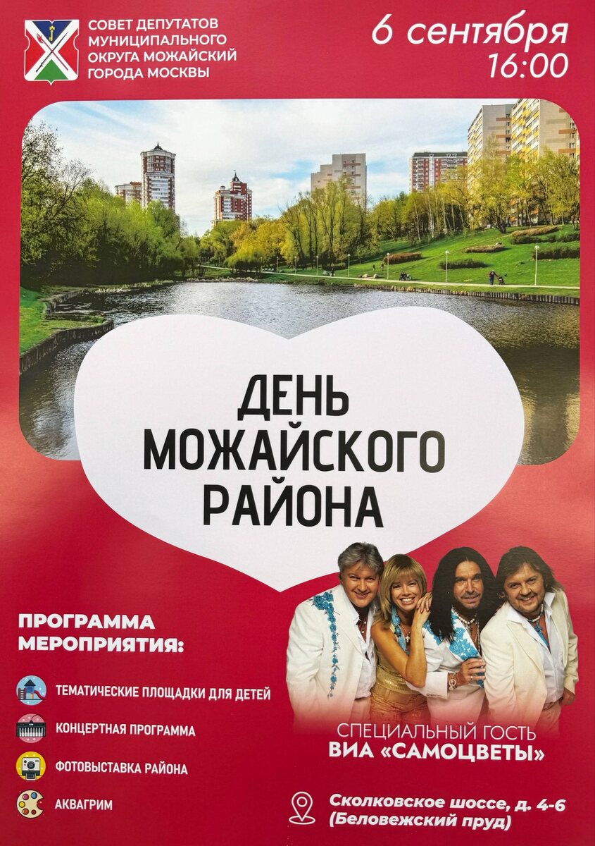 💫День Можайского района!💫 Приглашаем вас 6 сентября принять участие в праздничном мероприятии, посвященном Дню Можайского района. Вас ждет разнообразная развлекательная программа с выступлением одной из самых известных советских и российских групп – «Самоцветы». 🎆Праздник в зоне отдыха у Беловежского пруда объединит людей в атмосфере творчества, музыки и веселья. Для посетителей выступят коллективы района, здесь также организуют мастер-классы, тематические площадки. Будет работать большая выставка фотографий Можайского района в разные периоды его истории.🎆 🎡А детей ждут подвижные игры с аниматорами, аттракционы, шоу ростовых кукол. Для ребят проведут открытую тренировку по борьбе.🎭 #Школа1400 #ДОНМ #ДеньМожайскогоРайона