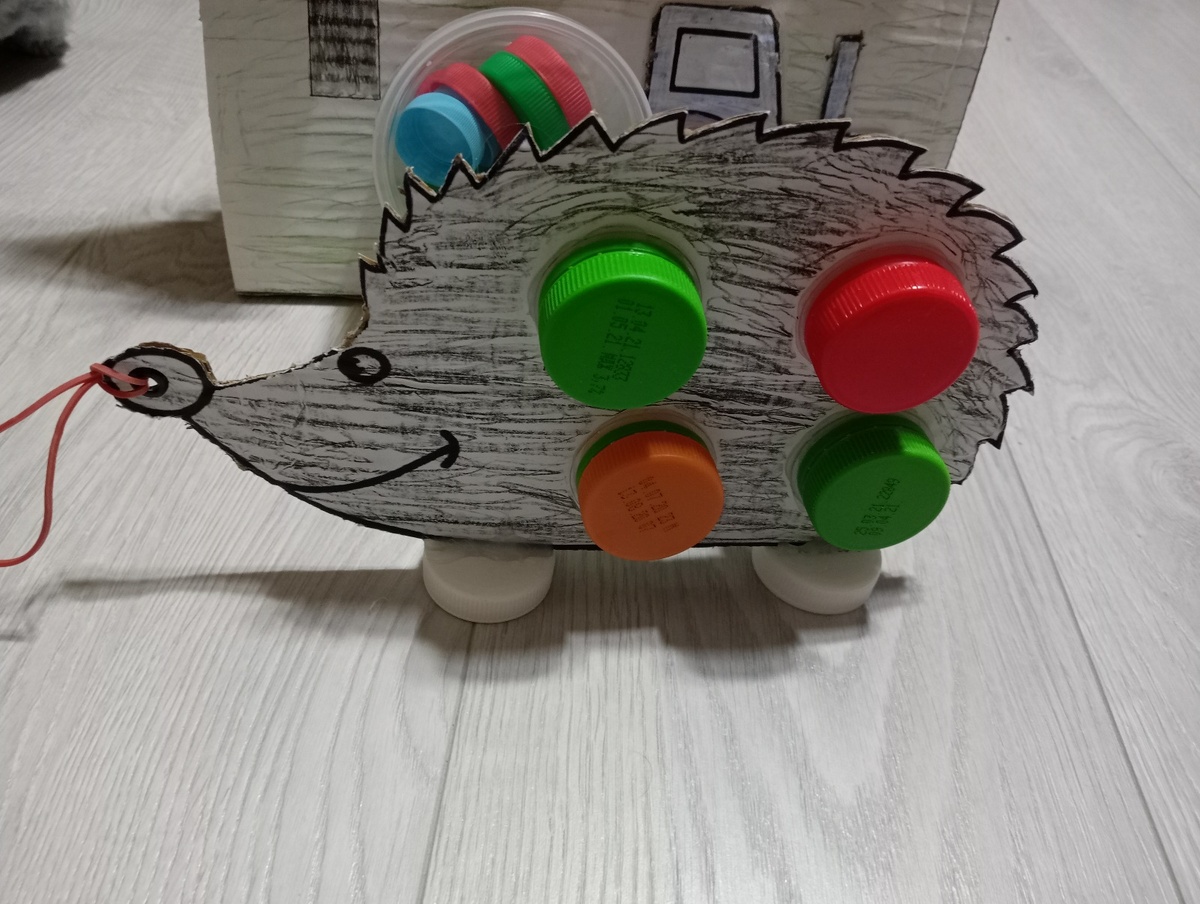 Продолжаю тему с поделками из крышек от пластиковых бутылок. Сегодня сделаем запасливого ёжика. Распечатал контур ежа из на листе формата А4. Затем наклеил его на крышку картонной коробки, и вырезал по линии. С обратной стороны дорисовал недостающие детали карандашом (или маркером). Сложно было обрезать горлышки бутылок с резьбой. Но справился. Обработал дополнительно дремелем. Наклеил заготовки на картонную основу с помощью термоклея. Теперь можно прикручивать «яблоки или груши». Потом добавил ёжику ножки, чтобы он мог стоять. Получилась интерактивная 3D модель ежа. В носике закрепил люверс и вставил резинку. Такая игрушка развивает у ребёнка воображение и мелкую моторику. Если просто ёжика недостаточно, то можно сделать дополнительную игру. Сортировку резинок. Резинки удобно хранить в импровизированном контейнере под крышкой. Казалось бы что может быть проще ёж и яблочки. Игрушка для малышей. Ёж, ёж, ты куда ползёшь? К бабушке под кровать, яблочки собирать... Но... ёж – это хищник,