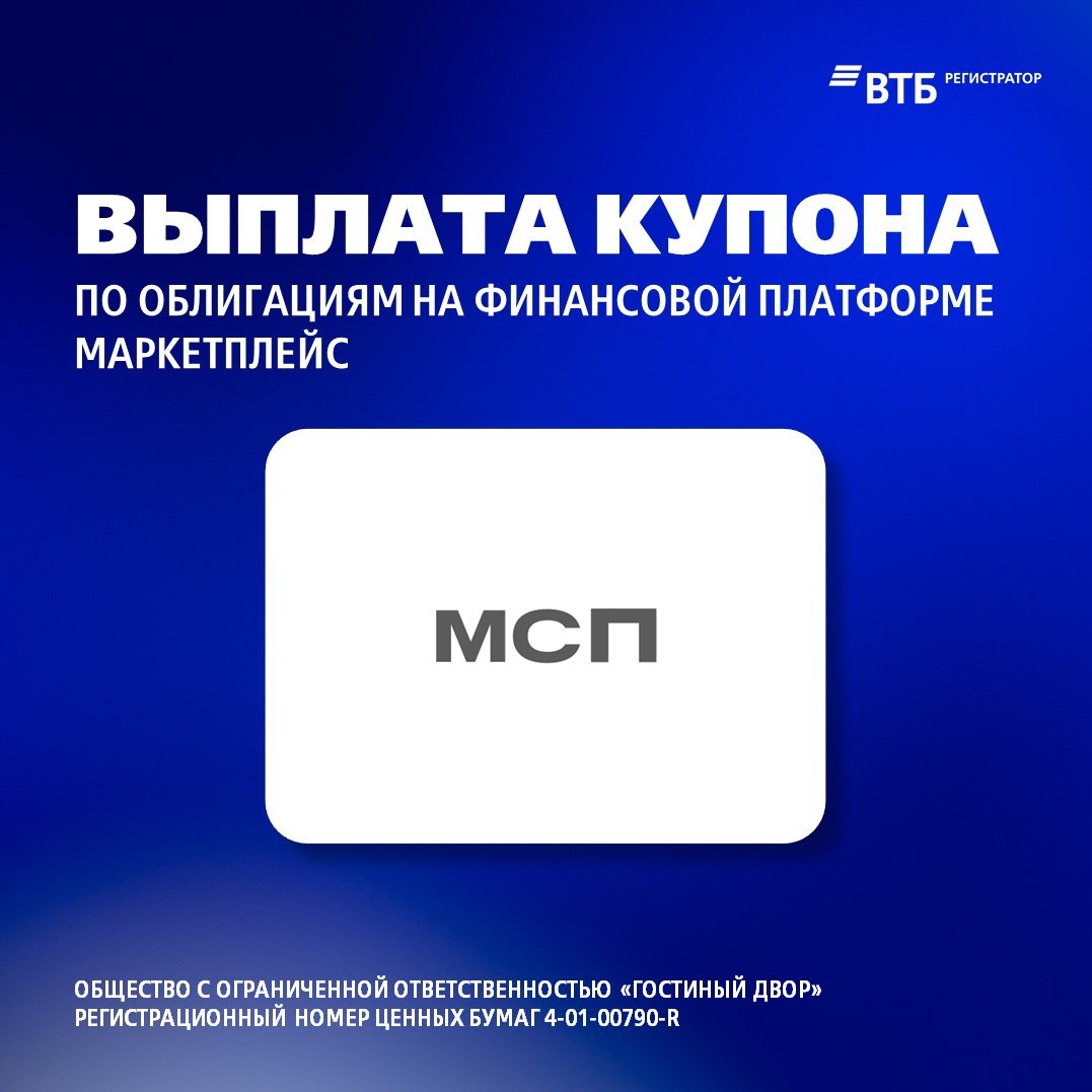 04.09.2025 ВТБ Регистратор осуществил выплату купона держателям облигаций ООО «Гостиный двор» (номер выпуска 4-01-00790-R). Купонный доход на одну облигацию составил 65,34 руб. (ставка купона 26,5% годовых). Облигации ООО «Гостиный двор» доступны на Финансовой платформе Маркетплейс. Не является индивидуальным инвестиционным предложением. #купон #выплаты #финансоваяплатформа #ВТБРегистратор