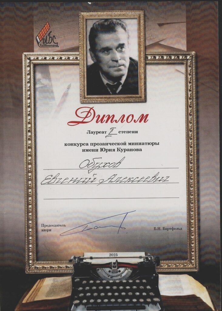 Обухов Е.А. – победитель Всероссийского литературного конкурса короткого рассказа имени Юрия Куранова