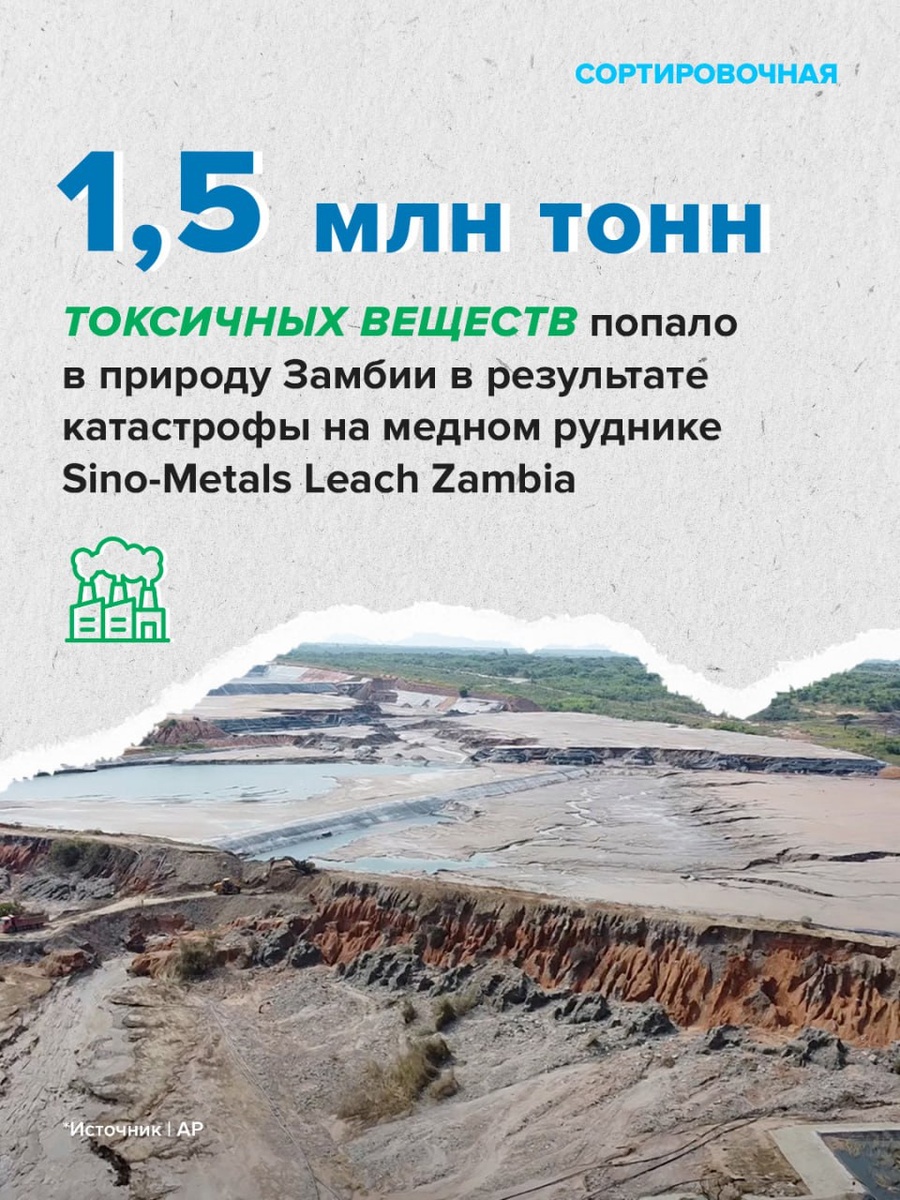 Последствия аварии в Замбии оказались куда страшнее В феврале этого года в Замбии случилась страшная катастрофа. На медном руднике китайской компании Sino-Metals Leach Zambia обрушилось хвостохранилище. В реку Кафуэ попало огромное количество токсичных отходов. ❕ Южноафриканская компания Drizit, которая занимается очисткой реки, заявила, что в окружающую среду попало 1,5 млн тонн токсичных отходов. Это в 30 раз больше, чем заявляла компания Sino‑Metals Leach Zambia. На данный момент 900 тыс. токсичных отходов продолжают находиться в природе. 🧪 В пробах нашли цианид, мышьяк, медь, цинк, свинец, хром, кадмий. Все эти вещества могут вызывать тяжелые заболевания, повреждение внутренних органов и приводить к развитию рака. Подробности этой ужасной катастрофы рассказывали в выпуске. Подписаться на Сортировочную 👍