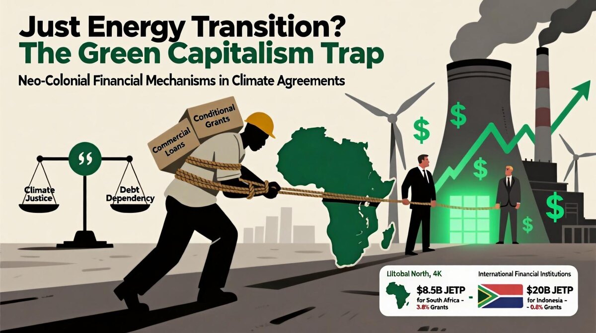 Партнёрства по справедливому энергетическому переходу (JETPs), преподносимые как механизм экологически и социально ответственного перехода, на практике функционируют как инструмент воспроизводства неравноправных отношений между центром и периферией. Несмотря на риторику справедливости, «зелёный переход» в странах Глобального Юга осуществляется на условиях, продиктованных интересами международного капитала, а не на основе реальных социально-экономических приоритетов народов этих стран.