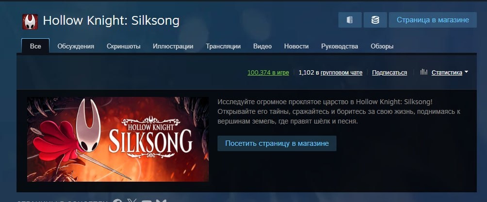 Hollow Knight: Silksong, несмотря на полуживой Steam, уже пробила онлайн в 100 тысяч игроков.