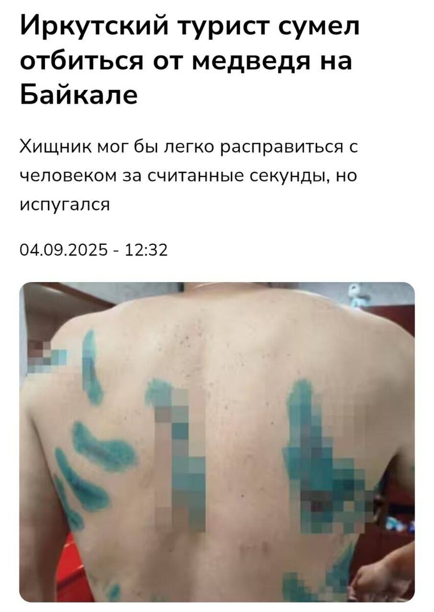 Россиянин подрался с медведем и победил. На Байкале в бухте Ая турист пошёл в лес и столкнулся с медведем. Тот повалил его, но мужчина отбился ударами кулаков и ног — медведь растерялся и убежал. Турист отделался царапинами 👉🏻Новости №1 в Ростове 💌Прислать новость/фото