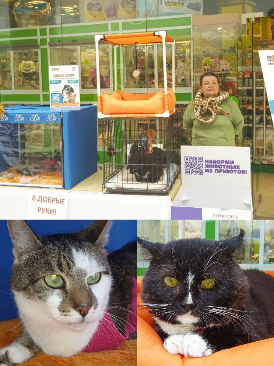Сегодня собирать корм для животных из приюта нам помогают трëхлапая мадам Табуретка и харизматичный господин Мавр