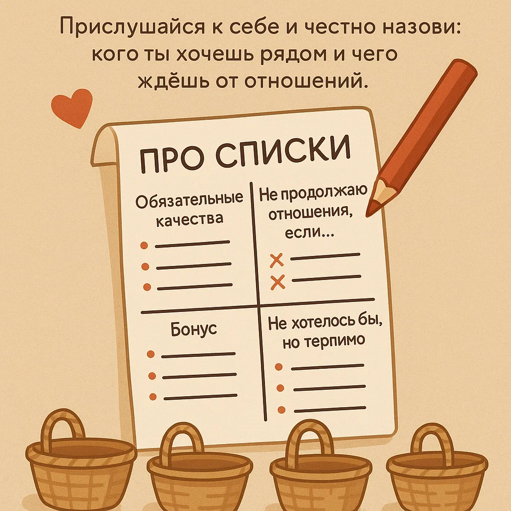 Вот это самое важный момент))) Отключи свою разыгравшуюся фантазию, сотри картинки из инсты, советы подружек и наставления мамы. Постарайся писать только то, что действительно важно ТЕБЕ! Ведь это твоя жизнь. Если для одной важны деньги и это сейчас продвигается, это не значит что и для тебя материальное состояние партнера должно вставать на первое место. А может и должно)