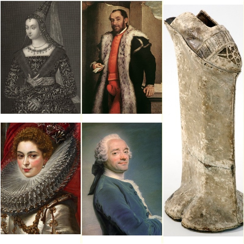История моды изобилует интересными предметами гардероба, которые кажутся нам невероятными, странными и даже абсурдными и удивительными. В этой статье предлагаю рассмотреть пять самых необычных экспонатах, которые точно не оставят вас безразличными. Цокколи (чопины)— итальянские женские туфли на невероятно высоких деревянных платформах, которые достигали в высоту до 50 см. Передвигаться в таких туфлях было крайне затруднительно, поэтому женщины для равновесия опирались на своих служанок. 2. Воротник «Мельничный жернов» Пожалуй, это один из самых странных и неудобных воротников в истории моды, появившийся в эпоху позднего Ренессанса, — это воротник «мельничный жернов». Этот огромный воротник создавался из тонкого белого полотна и кружев, огромного количества крахмала и специальных щипцов. Своим внешним видом напоминал огромный мукомольный жернов, отчего и получил свое название. Одно из самых экстравагантных явлений в мужском костюме XV - XVI веков — это гульфик очень огромного размера,