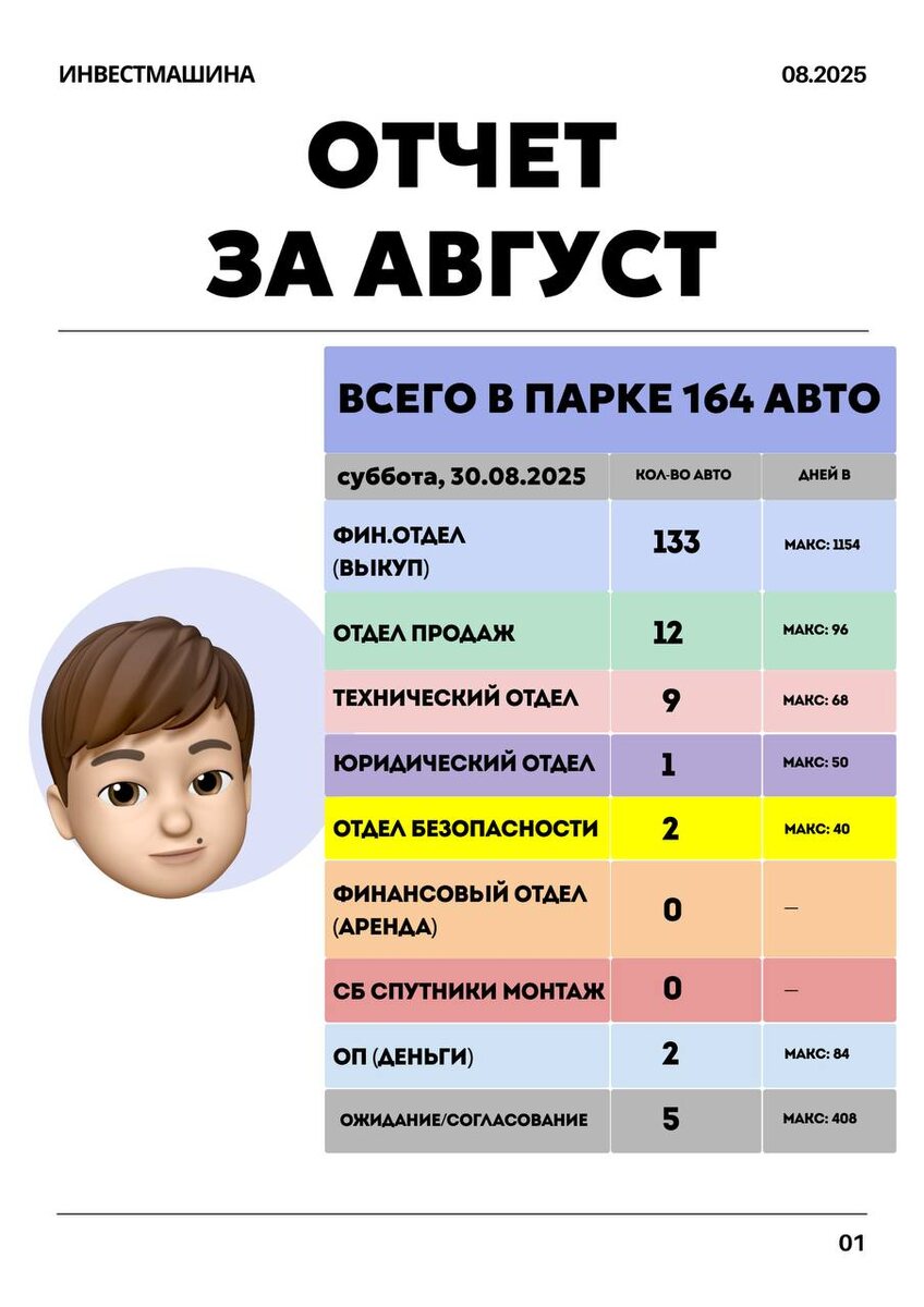 Ну что, Шуфутинский уже перевернул календарь - самое время подвести Итоги Августа😎 Поршни Инвестмашины работают ритмично и мы разгоняемся в преддверии высокого осенне-зимнего сезона: Арендаторы с руками отрывают автомобили, а инвесторы получают свой доход. • Всего — 164 авто 💰 Сдали под выкуп — 23 авто 🔁 Вернулись в парк — 19 авто 📦 Передали в ОП — 25 авто 📥 Приняли от инвесторов — 3 авто 🔓 Выкупов не было 💵 Продали в кэш для инвестора — 6 авто 💸 Выплачено инвесторам 5.284.610₽ В результате: предсказуемость дохода для инвесторов и устойчивость модели, проверенной годами. 🙌 Спасибо, что двигаемся вместе. Загрузка парка сейчас 83,6% — почти весь парк в работе. В отделе продаж осталось всего 12 авто! Автомобили быстро находят арендаторов, а капитал начинает работать с первого дня. Если тоже хочешь, чтобы деньги работали в активах, а не лежали мёртвым грузом — пиши. Подключим и покажем систему изнутри. 📩 Личка в тг — @slexels