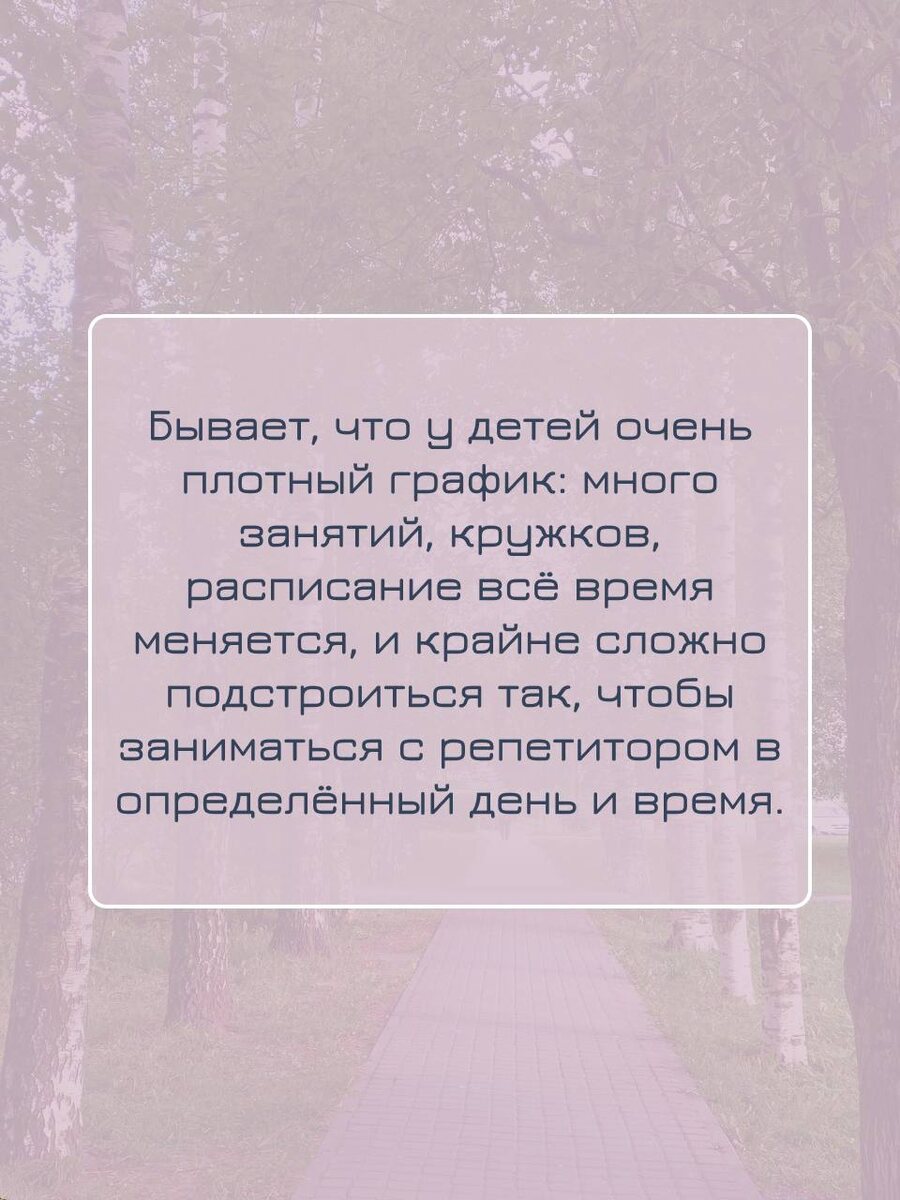 Бывает, что у детей очень плотный график: много занятий, кружков, расписание всё время меняется, и крайне сложно подстроиться так, чтобы заниматься с репетитором в определённый день и время.
