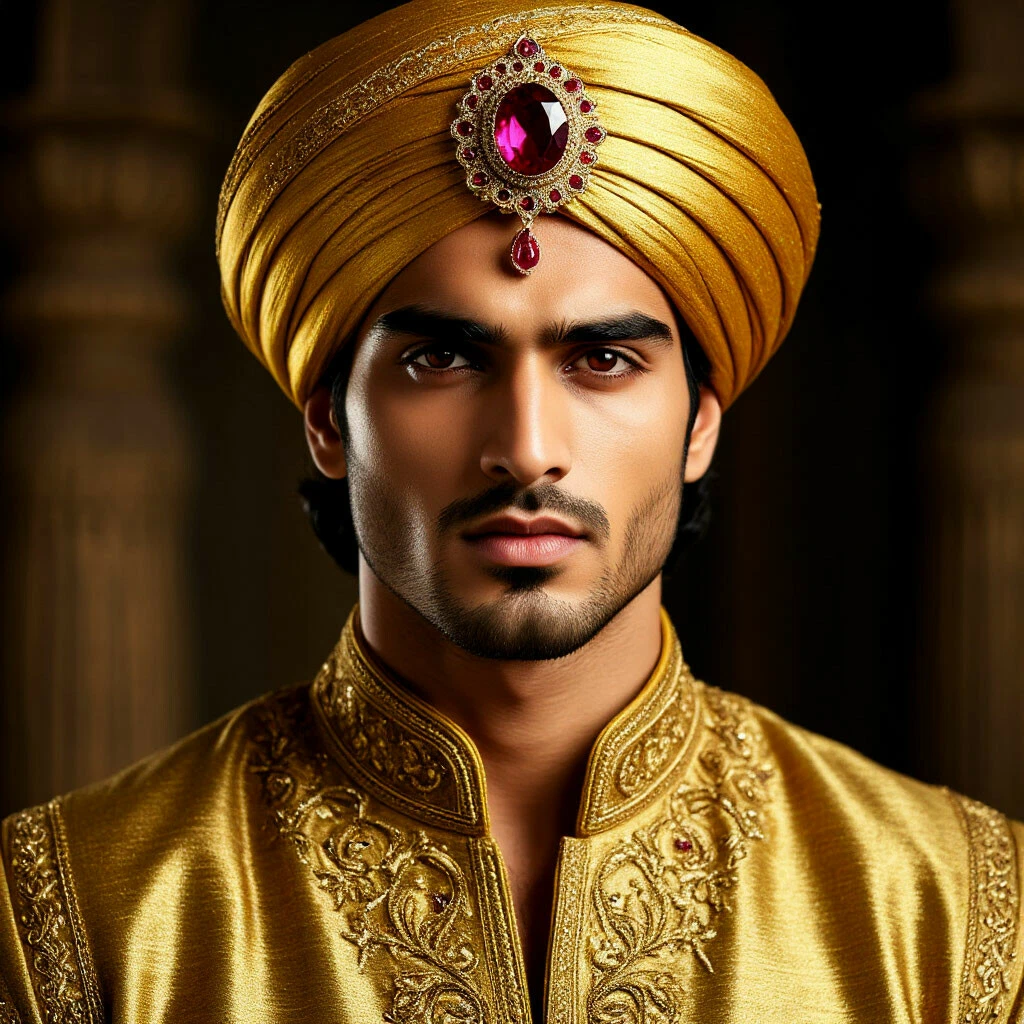 Двери дворца, возле которых стояли Мила и Тимофей, вдруг распахнулись и из них вышел Кемаль. Он предстал перед ними во всем великолепии восточного владыки, словно сошедшего со страниц древних сказок. Его фигура, исполненная достоинства и силы, была облачена в костюм цвета золота, состоящий из свободных брюк и просторной туники. Он подчеркивал его аристократизм и непринужденность. Ткань, из которой был сшит наряд, казалось, соткана из солнечного света. Золотистые нити, переплетаясь, создавали сложный узор, мерцающий при каждом движении. Отделка из тончайшей вышивки, выполненной золотыми нитями, украшала воротник туники и края рукавов. На голове Кемаля покоился тюрбан, выполненный из той же ткани, что и костюм. Он был искусно обернут вокруг головы, создавая сложную, но гармоничную форму, увенчанную драгоценным камнем - крупным рубином, сверкающим, словно капля застывшей крови.