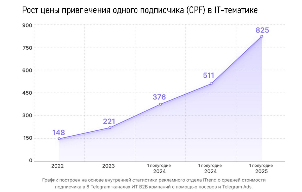 Реклама в телеге для IT-тематики подорожала на 120% Агентство iTrend исследовало более 100 каналов и кейсов медиапродвижения с общим бюджетом более ₽7 млн и получило неутешительные результаты. За первые 6 месяцев 2025 года стоимость привлечения одного подписчика (CPF) в b2b IT-каналах Telegram выросла на 120%: с ₽376 в 2024 году до ₽825. Цена за 1000 показов (CPM) для органического продвижения достигла ₽16 200, а если размещать рекламу через специальную биржу, будет ещё +10-20%. Всё это привело к медиаинфляции в IT-каналах для b2b-сегмента, с 2022 года она составила ~457%. На рост цен влияют популярность платформы, снижение порога входа в Telegram Ads, увеличение комиссии реселлеров до 20% и доплата за расширенные функции объявлений (например, добавление фото/видео +80%). Да и IT-тематика — одна из самых дорогих и узконаправленных. Требования Роскомнадзора к регистрации Telegram-каналов также повышают спрос на нативную рекламу. Помимо IT, заметный рост CPM в категориях "родители