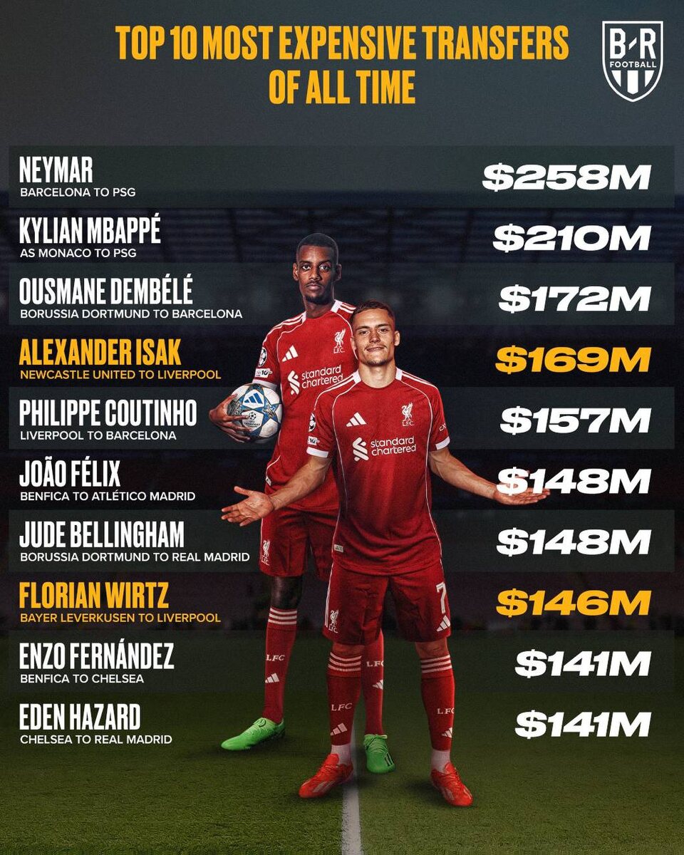 💵🏴Александр Исак и Флориан Вирц, пополнившие состав Ливерпуля, вошли в топ-10 самых дорогих трансферов всех времён