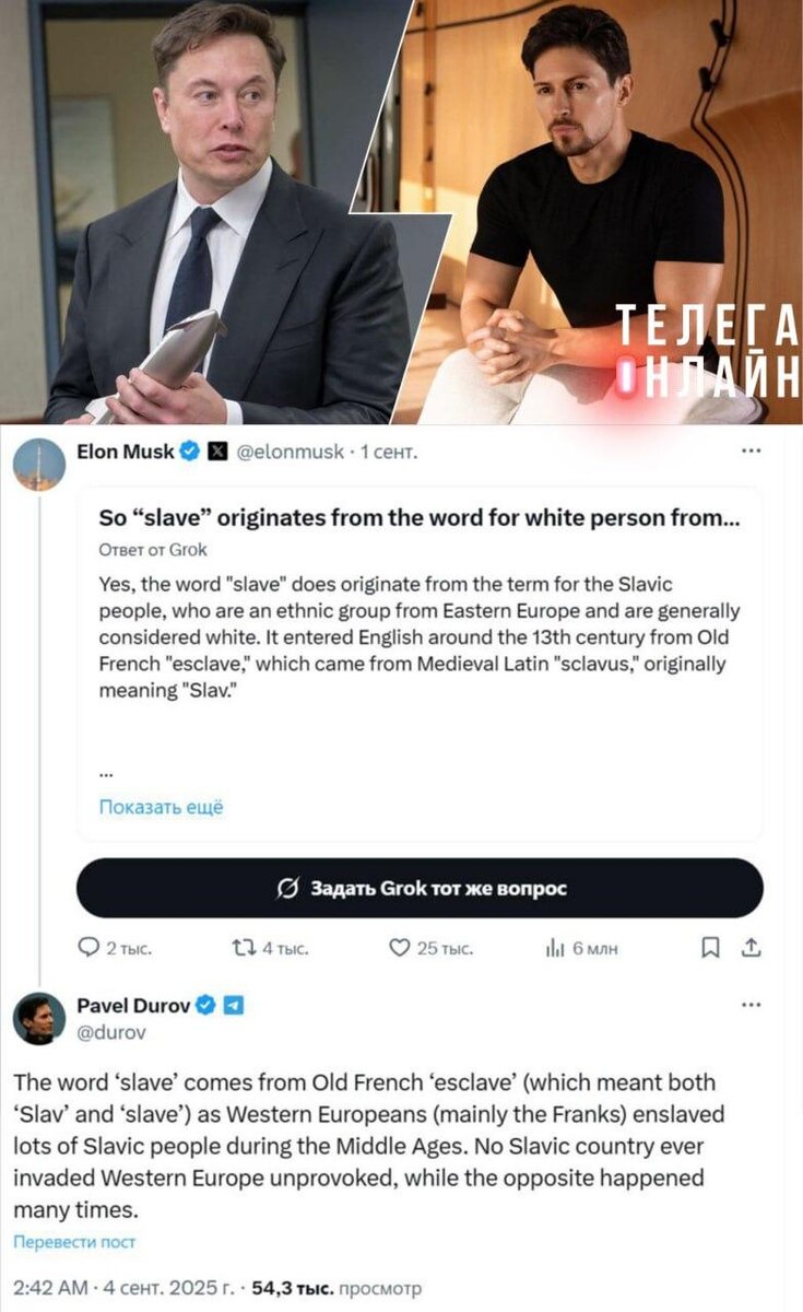 Наш слон из Telegram разъяснил их слону из Х, откуда взялось рабство и кто на самом деле веками был агрессорами: Маск: То есть слово «раб» произошло от слова, обозначающего белого человека из Восточной Европы? Дуров: Слово «раб» происходит от старофранцузского esclave (что означало одновременно «славянин» и «раб»), поскольку западные европейцы (в основном франки) в Средние века поработили множество славян. Ни одно славянское государство никогда не вторгалось в Западную Европу без какой-либо причины, в то время как обратное случалось неоднократно. Неожиданная, но познавательная дискуссия для IT-предпринимателей. 🚲 Подпишись на Телега Online